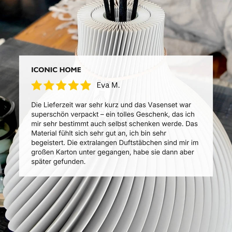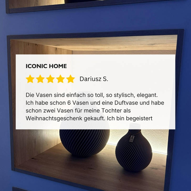 Los jarrones aromáticos de ICONIC HOME no solo destacan visualmente: también pueden utilizarse con aceites esenciales y varillas negras – todo incluido.