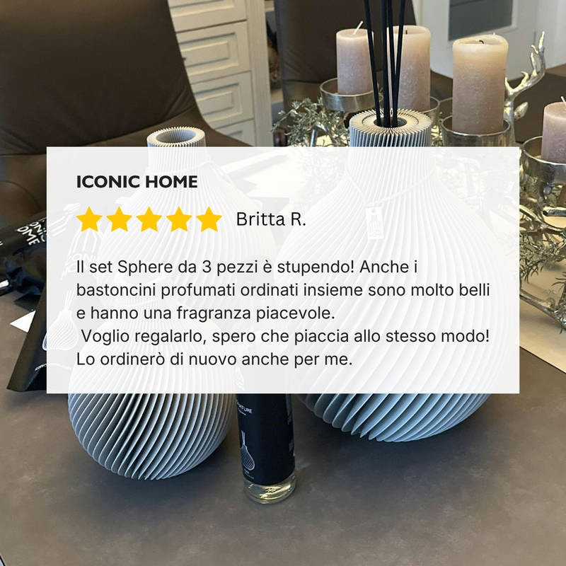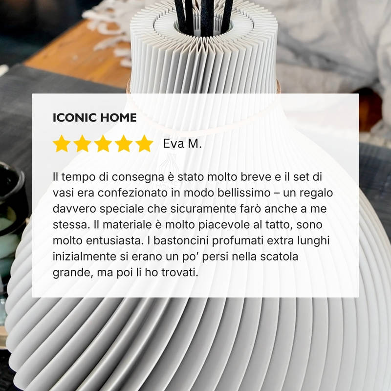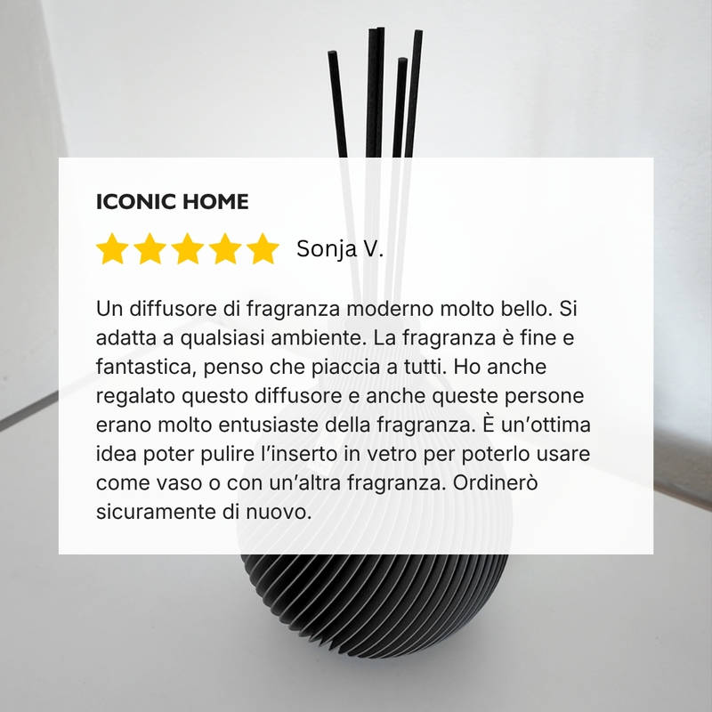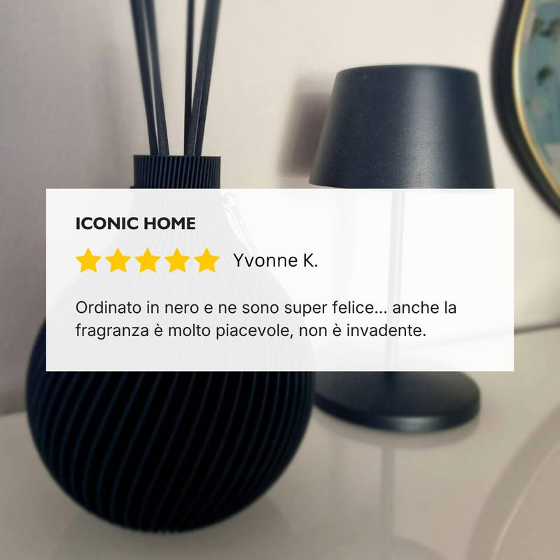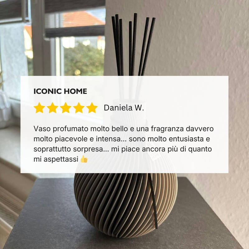 Il set comprende bastoncini profumati abbinati e la quantità scelta del profumo d’ambiente ICONIC HOME “Signature”.