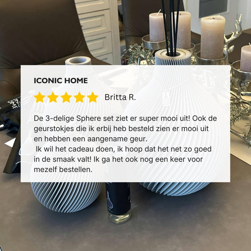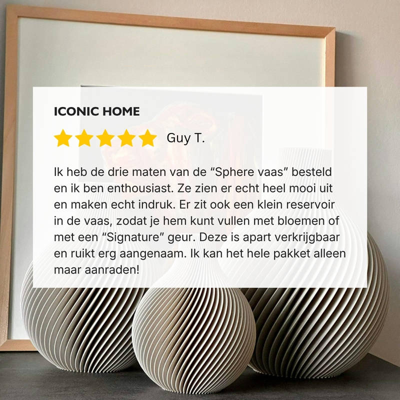 Ik heb de vaas Sphere in 3 maten en verschillende kleuren besteld. Alle drie zijn het blikvangers die niet alleen mij bekoren, maar ook mijn gasten versteld doen staan. Ontwerp in perfectie met effect!