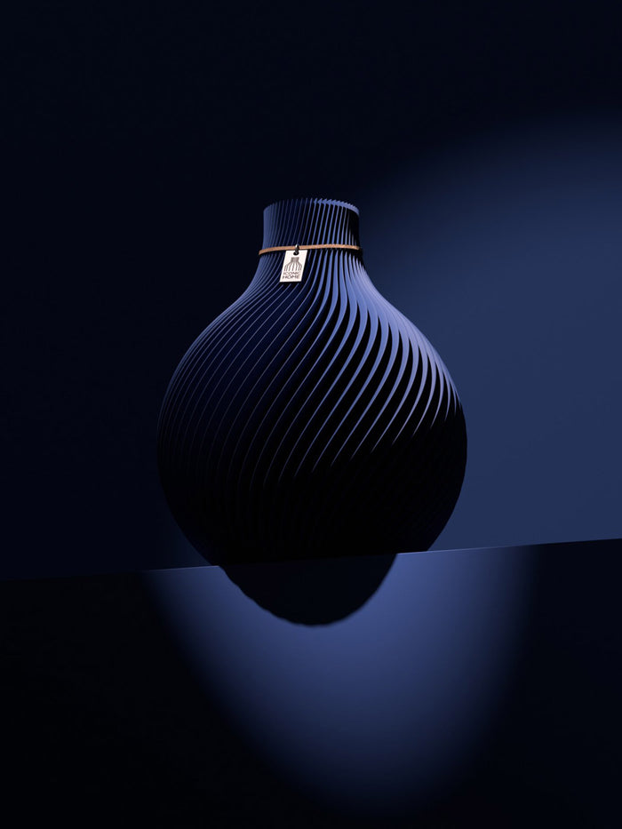 Moderne Vasen in Blau lassen sich in unterschiedlichen Formen und Techniken realisieren, klassischerweise etwa durch Glasschmelze oder Keramik. Eine neue Möglichkeit und damit auch Wegbereiter für außergewöhnliche Formen ist der 3D-Druck. Fein gearbeitete Linien, organische Silhouetten oder geometrische Strukturen lassen den dunkelblauen Farbton der 3D-gedruckten Vasen von ICONIC HOME lebendig erscheinen. Der Lichteinfall beeinflusst dabei die Intensität und Tiefe des Blautons – ein interessantes Wechselspiel für Wohnräume mit Tageslicht.